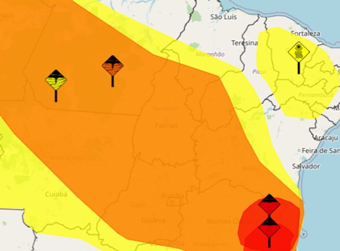 São dois avisos ativos: o primeiro com grau de severidade laranja, que significa “perigo”, cobre quase todo o estado e prevê um volume de chuva diário que pode chegar até 100 milímetros em um dia. O segundo, de nível amarelo, cobre o Bico do Papagaio.