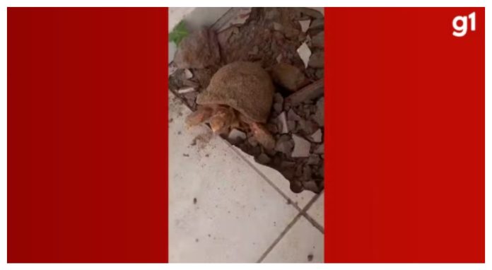 Vídeo mostra jabuti soterrado sendo retirado vivo embaixo de piso de casa