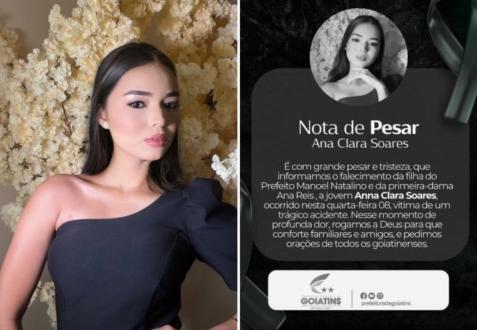 Um grave acidente matou Anna Clara Soares, filha do prefeito de Goiatins, Manoel Natalino (Republicanos). O carro em que estava a jovem saiu da pista, na tarde desta quarta-feira (8), perto de Barra do Ouro, no norte do estado.