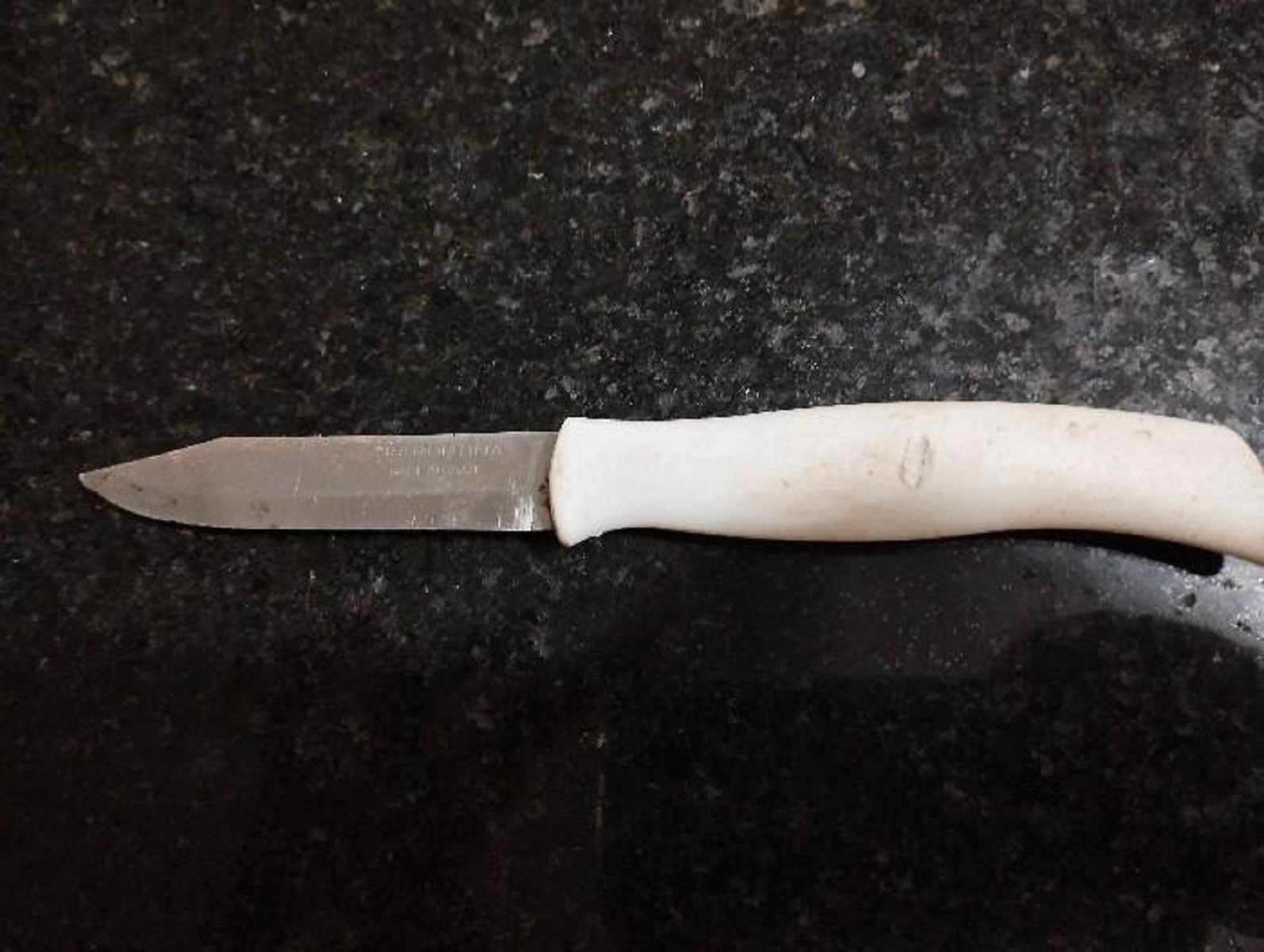 O suspeito portava a faca possivelmente utilizada no crime e estava com tornozeleira eletrônica descarregada. A Polícia Penal foi avisada da situação.