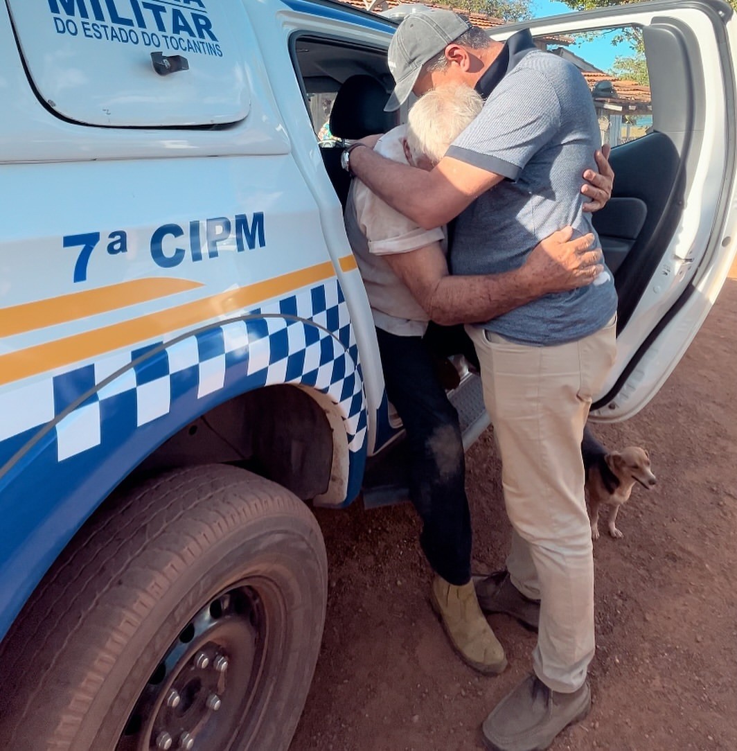 Idoso desapareceu na noite da segunda-feira (29) e só foi encontrado na tarde da quarta-feira (31). Bombeiros, trabalhadores da propriedade, PMs do Tocantins e de Goiás participaram das buscas, junto de cães farejadores. Idoso abraçando familiar após ser encontrado
