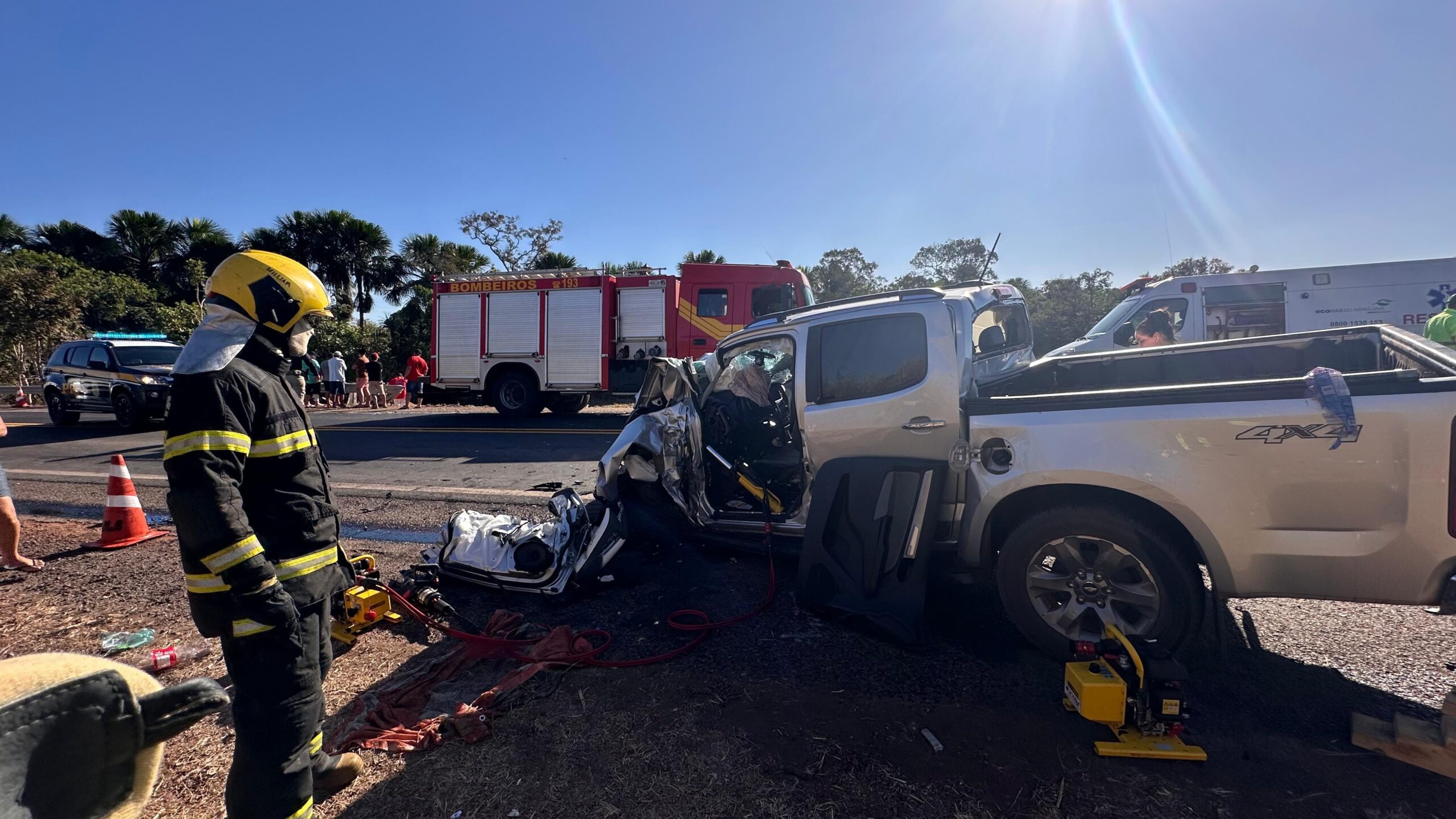 O motorista de uma caminhonete ficou preso às ferragens após bater de frente com um caminhão na BR-153, próximo a Dueré. O acidente aconteceu na tarde deste domingo (14) e deixou a rodovia interditada por cerca de 1h, no km 653.