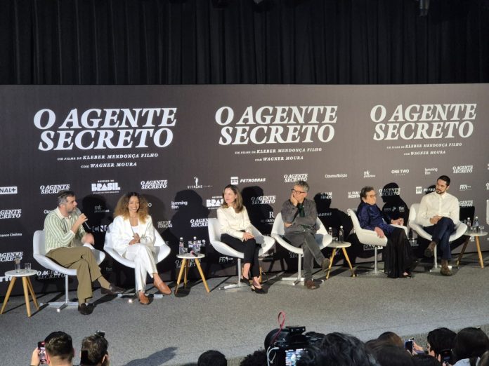 Wagner Moura, Alice Carvalho, Emilie Lesclaux, Kleber Mendonça Filho, Tânia Maria e Gabriel Leone na coletiva de imprensa do filme “O Agente Secreto”, em São Paulo