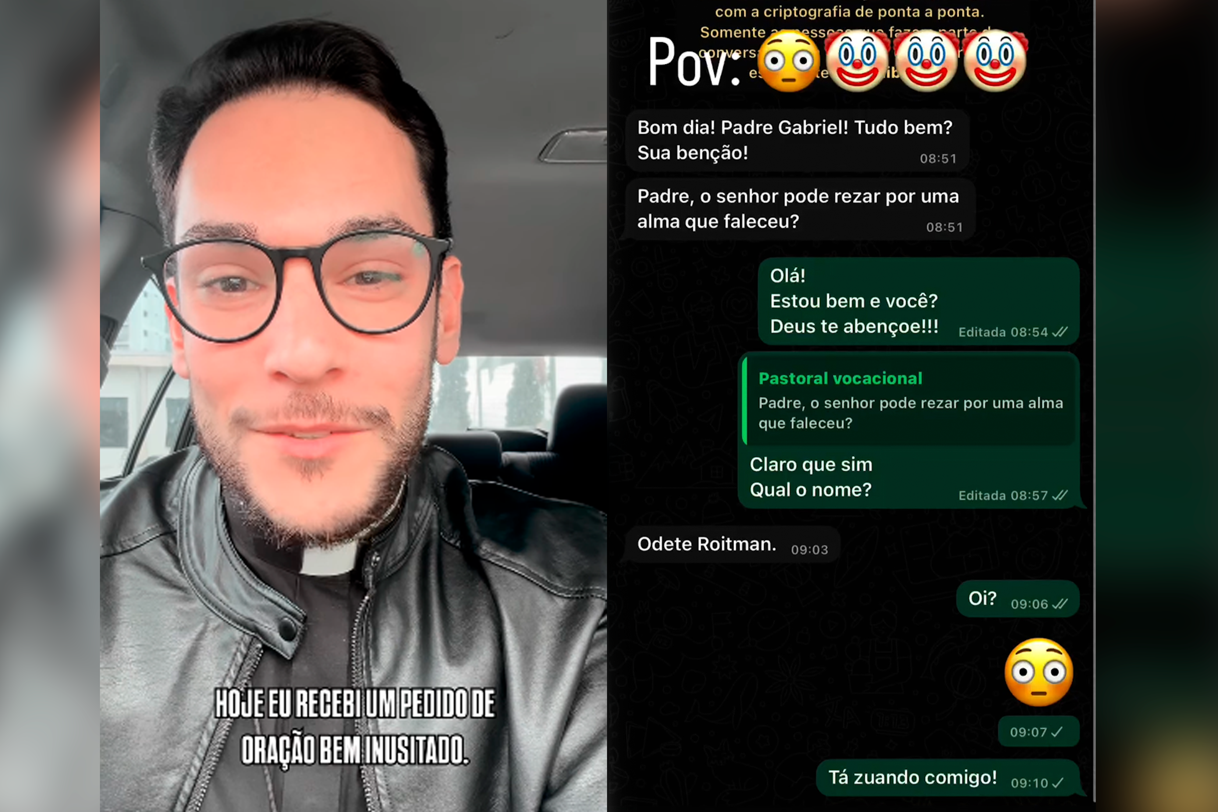 “Hoje recebi um pedido de oração bem inusitado. Um paroquiana mandou bem assim: o senhor pode rezar por uma pessoa que faleceu? Eu falei claro. Qual o nome? Ela mandou: Odete Roitman”, contou.