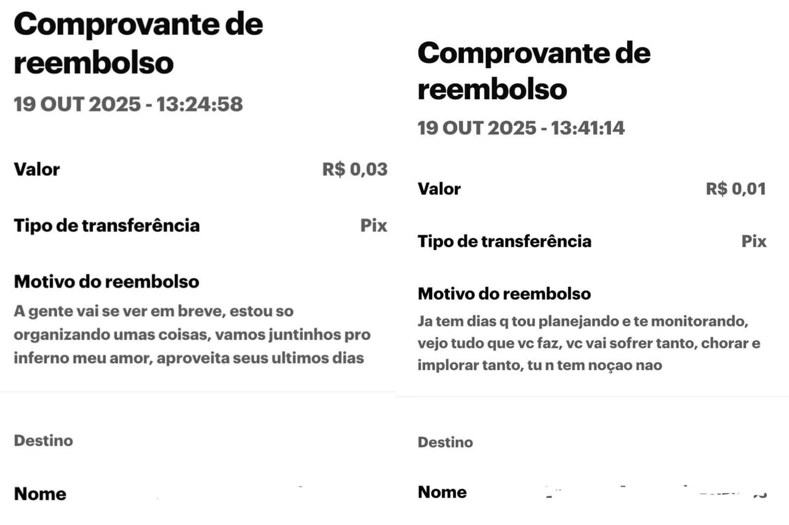 Enquanto estava na delegacia, no início da tarde de domingo (19), o suspeito, de 29 anos, enviou pelo menos sete transferências via Pix para ela, com valores em centavos. Em um espaço reservado para o correntista fazer alguma observação, ele escrevia as ameaças à ex, já que estava bloqueado para entrar em contato por meio das redes sociais da jovem.