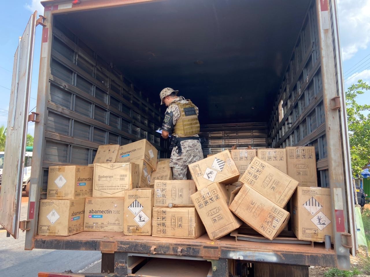 Na abordagem, os policiais flagraram os três suspeitos e dentro do caminhão havia cerca de 800 litros de inseticida e três mil litros de fungicida. O caminhão também tinha registro de furto.