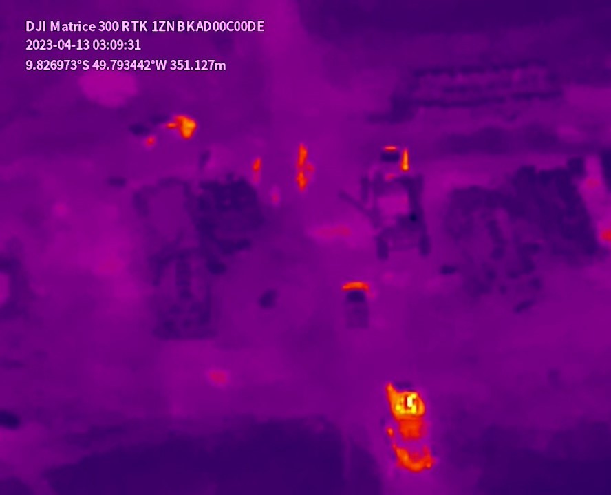 Neste caso específico se tratavam apenas de trabalhadores rurais, mas as imagens mostram como a tecnologia possibilita a identificação de zonas de calor formadas pelo motor dos veículos e a temperatura corporal das pessoas.
