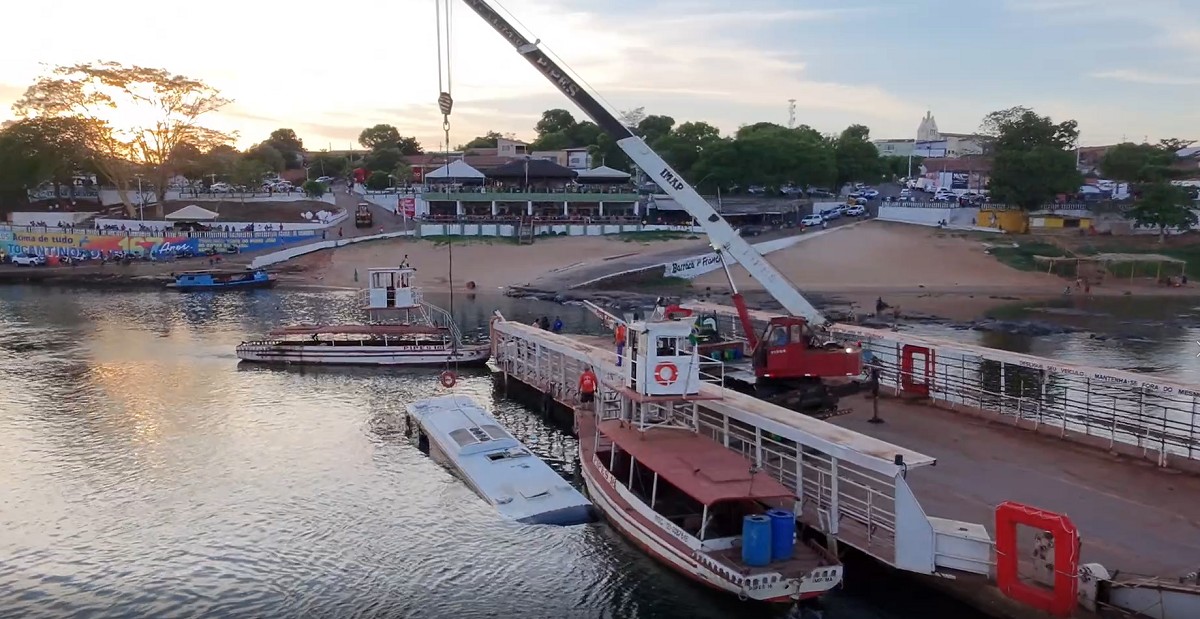 O ônibus de turismo que caiu de uma balsa em Tocantinópolis, no Bico do Papagaio, foi retirado do Rio Tocantins na tarde desta segunda-feira (27). A ação foi realizada pela empresa responsável pelo veículo e pela Pipes, que administra a balsa na cidade. Imagens registradas no local mostraram parte dos trabalhos (assista acima).